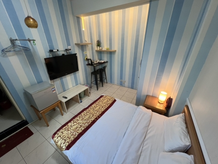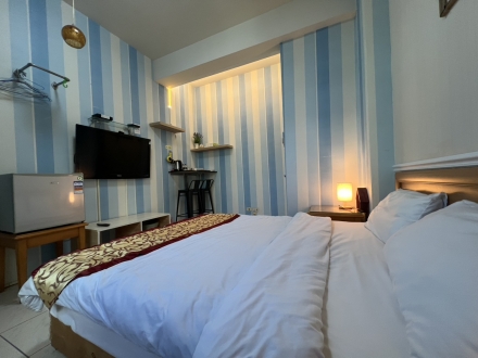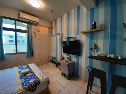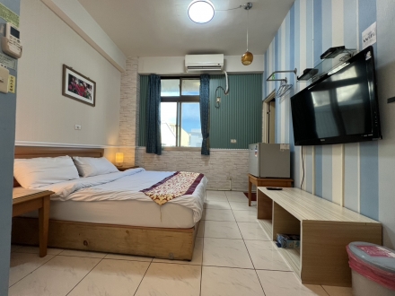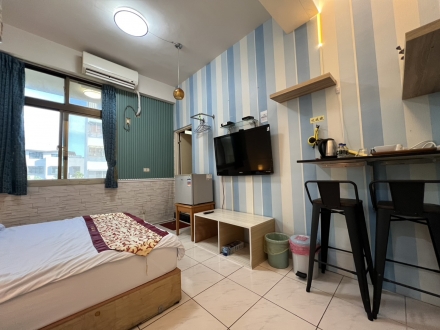7.家具:液晶電視、獨立冰箱、免費鹽洗用品、小夜燈、寢具組(枕頭、棉被、床包) 、雙人床墊、衛生紙、毛巾、拖鞋、吹風機、床邊插座、電風扇、電熱水壺、桌椅休息區、獨立空調、無線WI-FI上網、分類垃圾桶